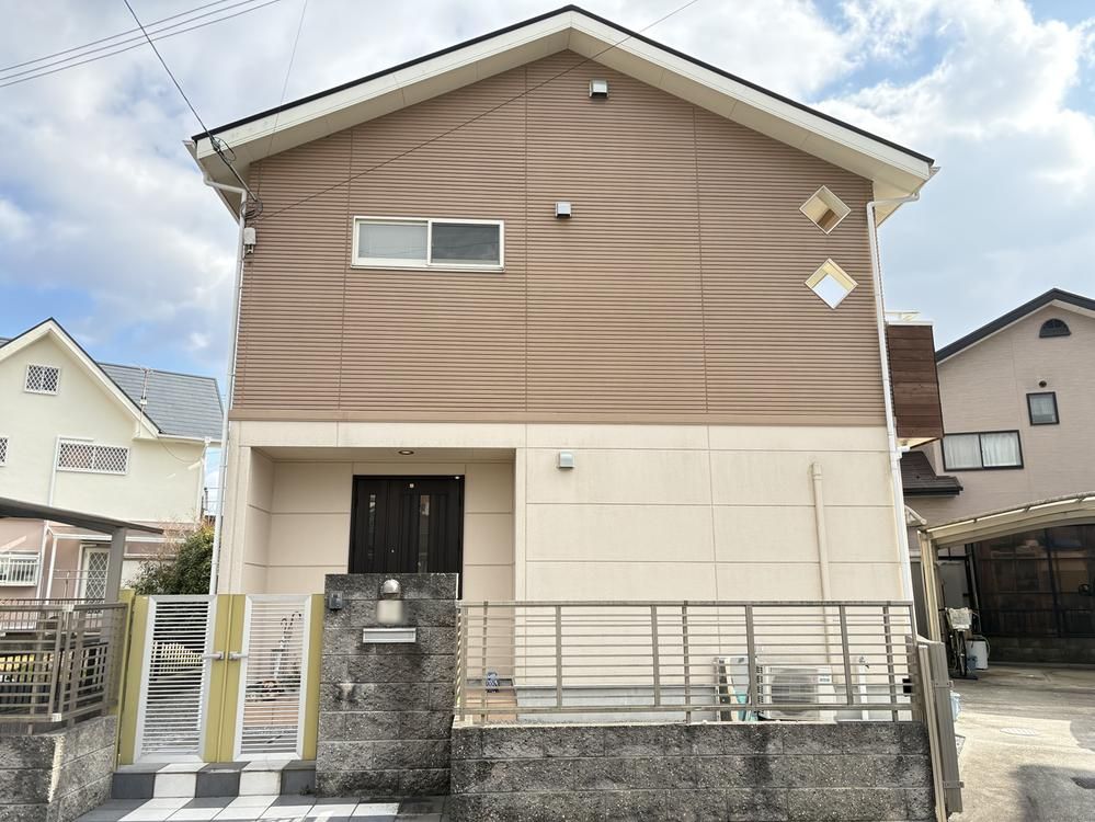 The home is equipped with a modern counter-style kitchen, allowing parents to keep an eye on children while preparing meals. Other notable features include two toilets, an automatic bath, a loft, a window in the bathroom, a wood deck, a living room staircase, and flooring throughout all rooms. The property utilizes all-electric systems, and an Eco Cute water heater has already been replaced. The location is within a quiet, green residential area with generous spacing between neighboring houses.