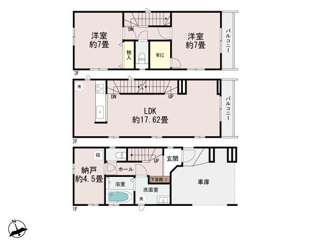 This newly built detached house, scheduled for completion in March 2026, offers a modern and comfortable living space in Kawasaki's Saiwai Ward. The property features a generous total floor area of 104.75 sqm (approximately 31.68 tsubo) spread over three stories, with a 2SLDK layout. The land area is a measured 54.99 sqm (approx. 16.63 tsubo). Key equipment and features include two toilets, a bidet toilet seat with reheating function, a bathroom dryer and heater, a bathroom window, a shower-equipped vanity, a system kitchen, an independent and open kitchen layout, a dishwasher, underfloor storage, storage in all rooms, a 24-hour ventilation system, flooring in all rooms, double-glazed windows, downlights, a monitor intercom, a double-lock door, a dimple key, security glass, a fire alarm, and connections for city gas, electricity, and water/sewer. A special note highlights that all rooms benefit from two-sided natural lighting.
