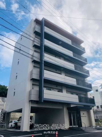 Key features include excellent views of the Chatan townscape and the ocean, good sunlight, and a quiet location. The property is well-equipped with a system kitchen, gas cooking, separate bath and toilet, unit bath with a bathtub, independent washroom, air conditioning, heating, dryer, and a TV monitor intercom system. Building amenities include an elevator, parcel delivery box, and an auto-lock security system. The apartment is pet-friendly, subject to conditions.