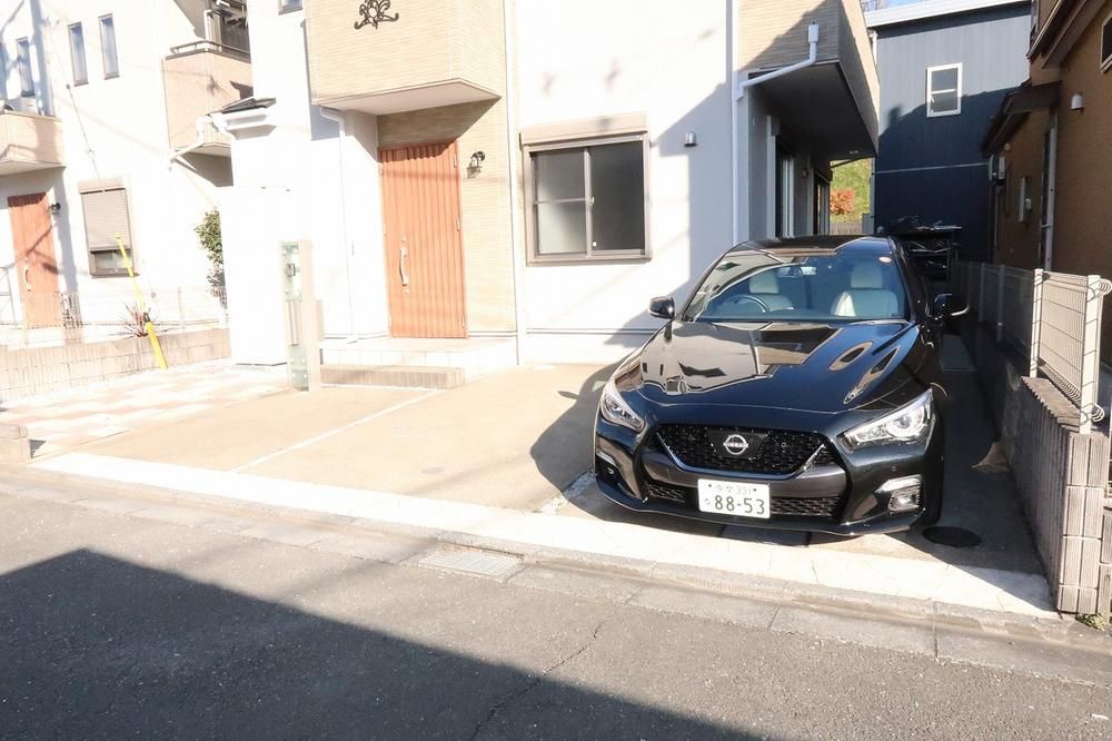 The house includes a system kitchen with an IH cooking heater, a system bath with a bath heater and dryer, and two toilets. All living rooms are 6-jo or larger and feature built-in storage. The property sits on a regular-shaped, flat plot of land facing a 5-meter public road. Parking is available for three or more cars in a high-roof parking space. The home is all-electric and includes features such as a wide south-facing balcony, underfloor storage, a TV monitor intercom, double-glazed windows or sashes in all rooms, a water purifier, and an attic storage space (grenier). The surrounding area has relatively low traffic volume.